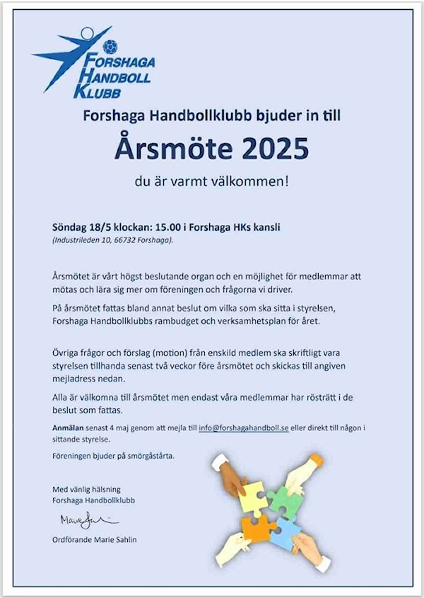 Forshaga Handbollklubb bjuder in till årsmöte 2025 och du är varmt välkommen!